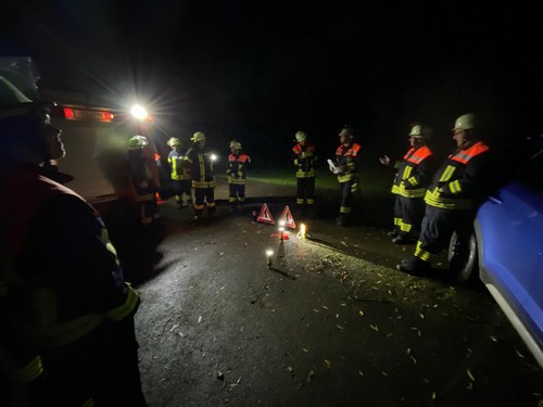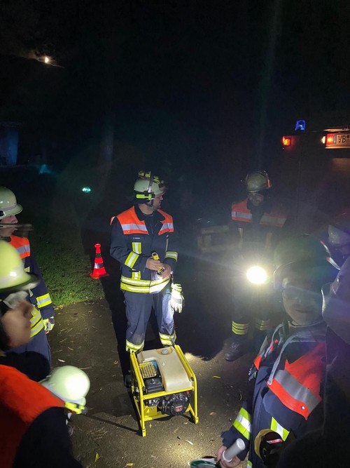 09.12.2023 - Bereits am Freitag, den 10.11., fand das praktische Übungsjahr der Wehren Stumpertenrod und Köddingen statt. Angenommen war ein Flächenbrand und Vegetationsbrand. Mit versperrter Zufahrt durch umgestürzte Bäume. Dank ausreichend Wasser im Katharinenbach, konnte man diese Übung nass abhalten, was im Sommer nicht der Fall war. Die rund 20 Einsatkäfte bauten eine Wasserversorgung bis zu einem Wassersack auf und gingen von dort zur Brandbekämpfung und Ausleuchten der Einsatzstelle über.
